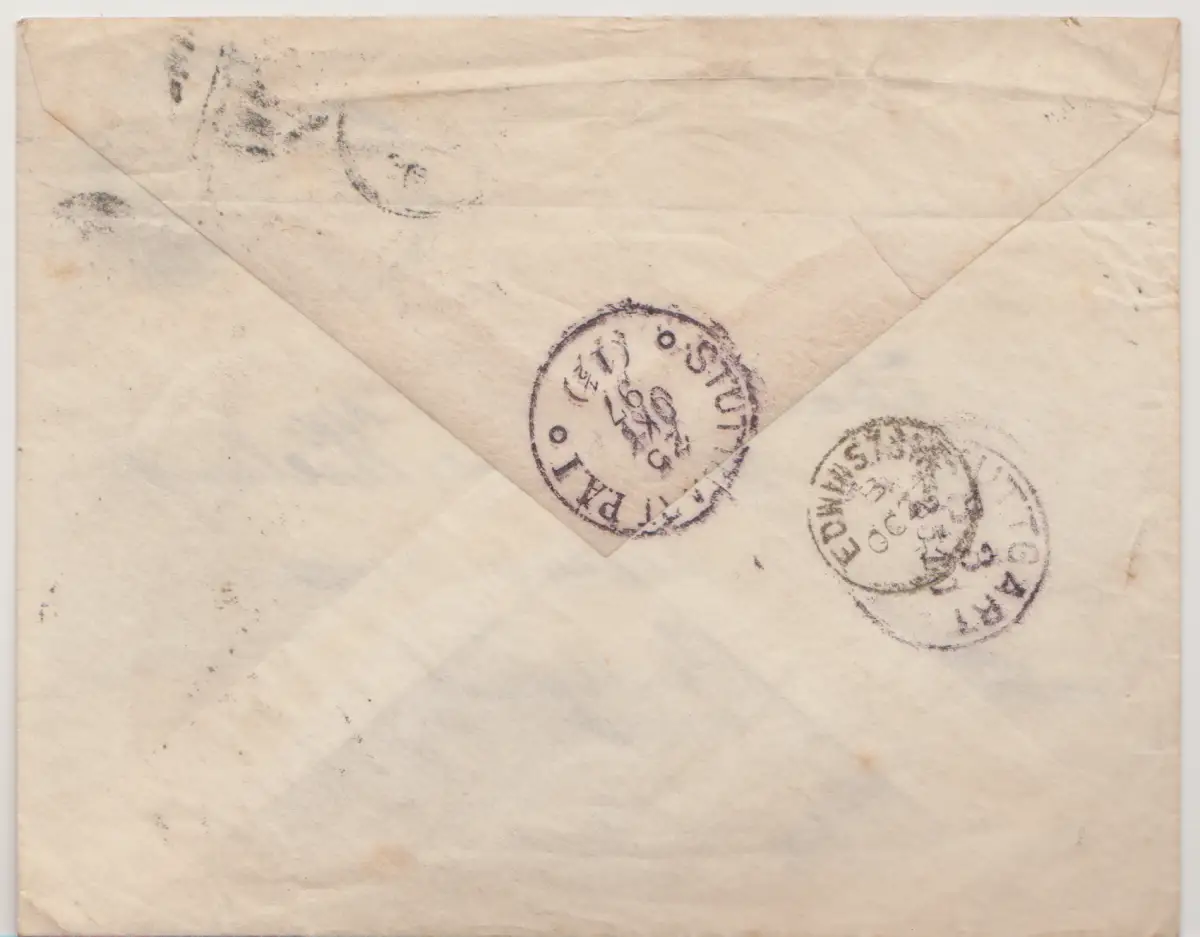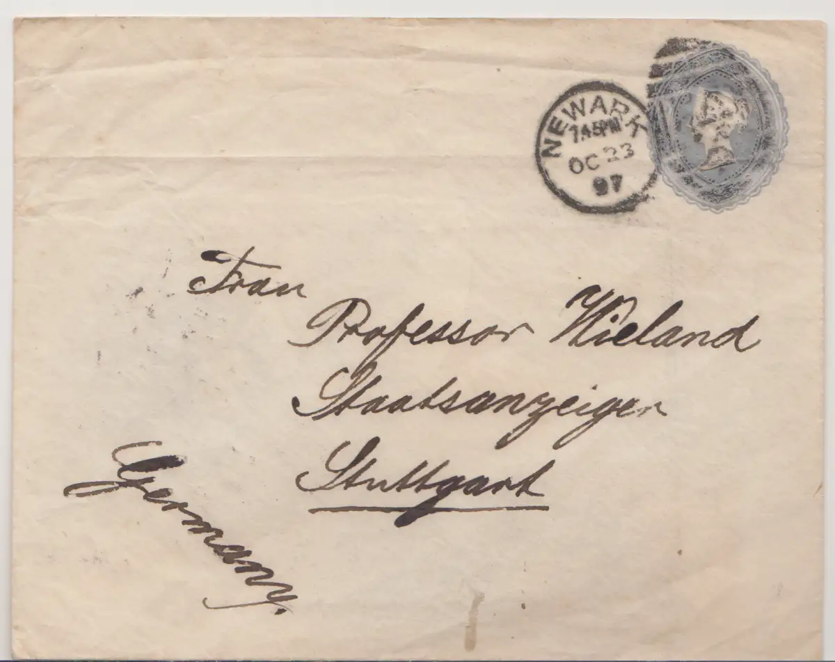 Der Briefumschlag ist gelaufen am 23.10.1897 von Newark nach Stuttgart.