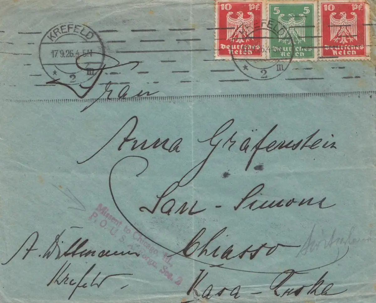 USA 1926: Kreefeld to Chicago, Missent to Chicago Ill