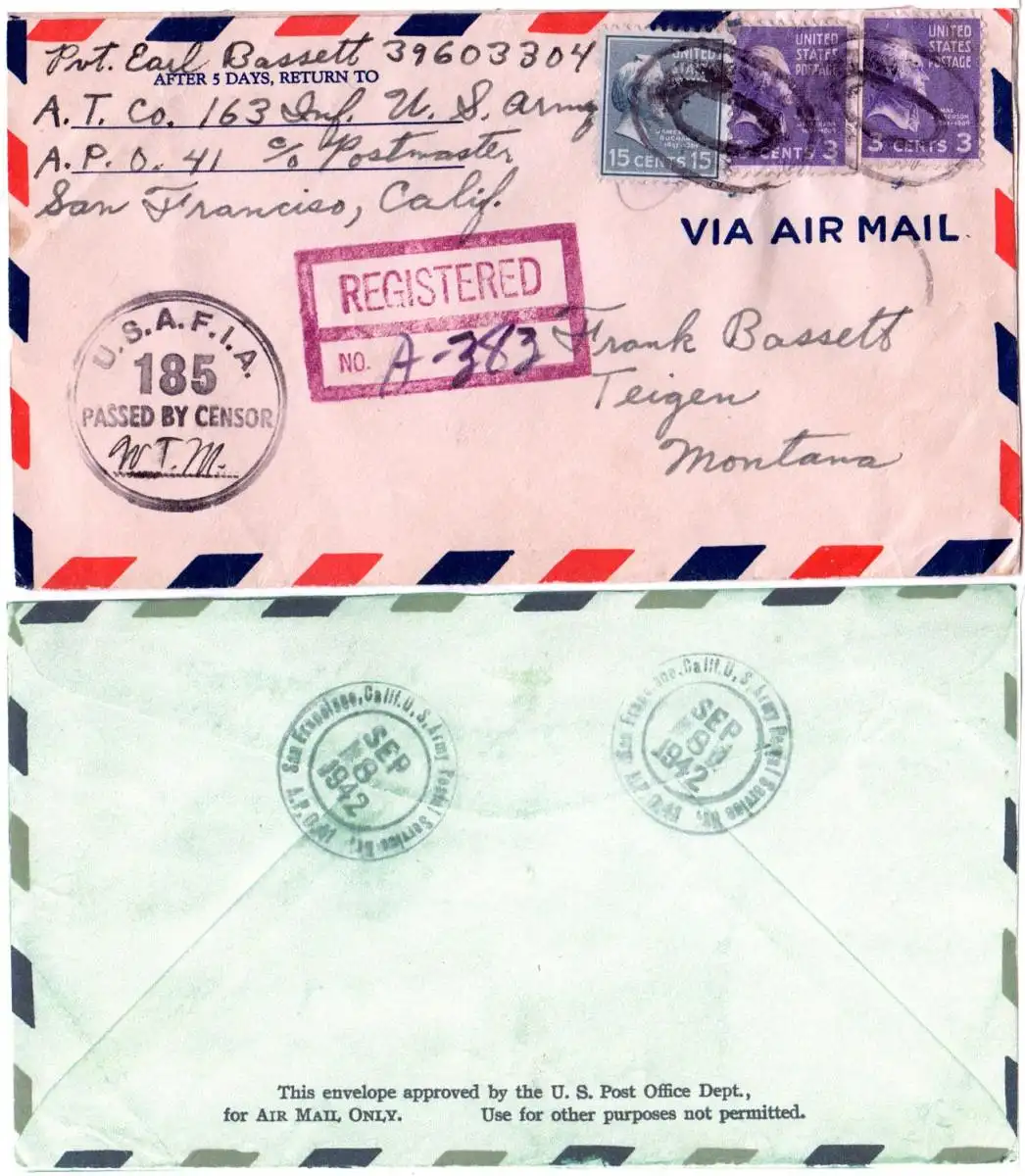 15+2x3 C. auf A.P.O. 41 Einschreiben Zensur Brief m. rücks. San Francisco, Calif. U.S.Army Postal Service Br. A.P.O.41