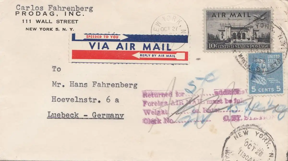 USA 1952: air mail New York to Lübeck, Returned for 5c additional