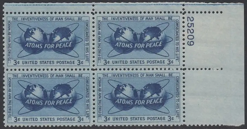 USA Michel 0691 / Scott 1070 postfrisch PLATEBLOCK ECKRAND oben rechts m/Platten-# 25209 (a) - Atomkraft für den Frieden: Atomsymbol mit Erdhalbkugeln