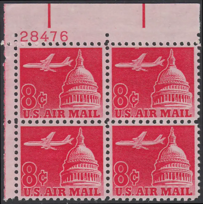 USA Michel 0836A / Scott C064 postfrisch LuPo-PLATEBLOCK ECKRAND oben links m/Platten-# 28476 - Düsenverkehrsflugzeug Douglas DC-8 über Kapitol