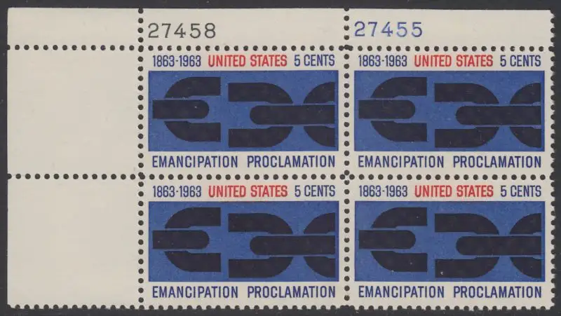 USA Michel 0846 / Scott 1233 postfrisch PLATEBLOCK ECKRAND oben links m/Platten-# 27458 - 100. Jahrestag der Verkündung der bürgerlichen Gleichstellung durch Abraham Lincoln