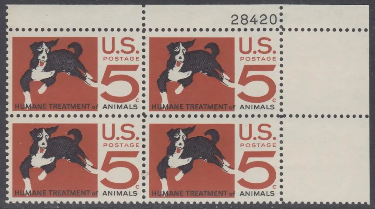 USA Michel 0898 / Scott 1307 postfrisch PLATEBLOCK ECKRAND oben rechts m/Platten-# 28420 - 100 Jahre amerikanischer Tierschutzverein; Hund