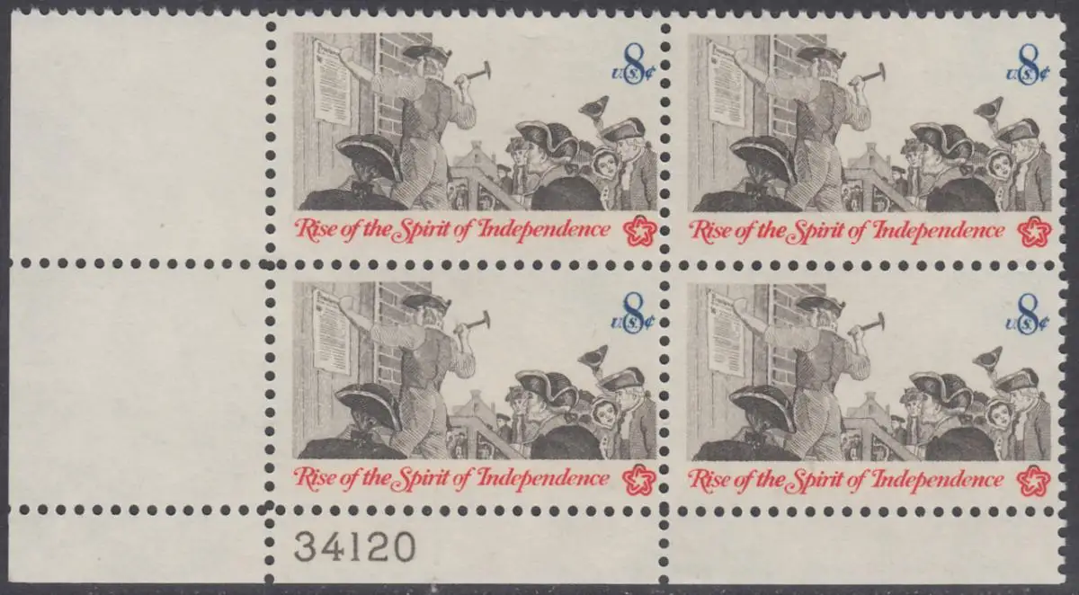 USA Michel 1094 / Scott 1477 postfrisch PLATEBLOCK ECKRAND unten links m/ Platten-# 34120 - 200 Jahre Unabhängigkeit der Vereinigten Staaten von Amerika (1976): Nachrichtenwesen zur Kolonialzeit; Anschlagen eines Flugblattes