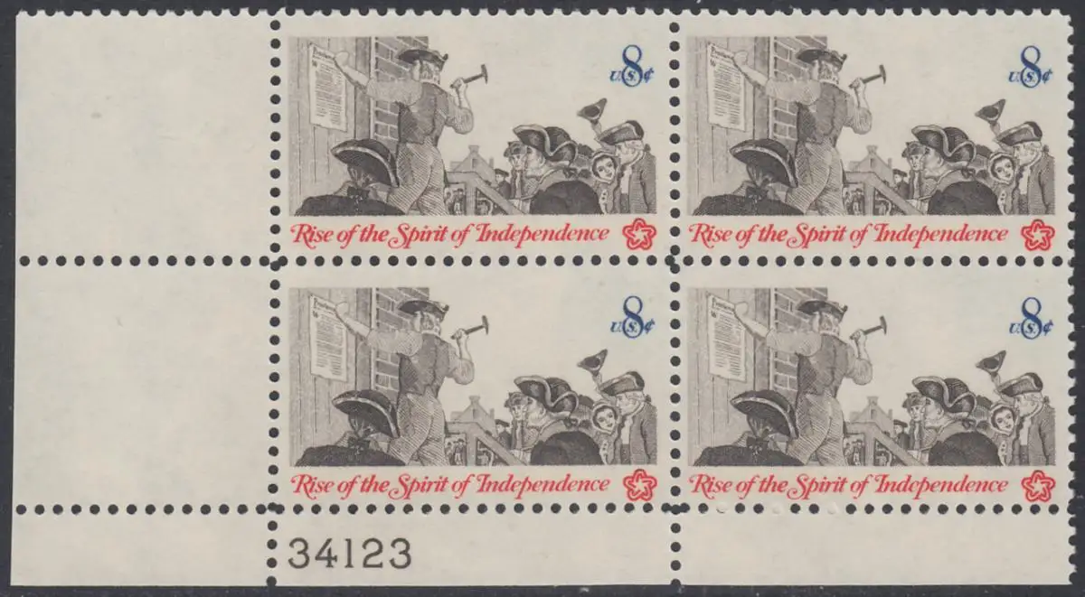 USA Michel 1094 / Scott 1477 postfrisch PLATEBLOCK ECKRAND unten links m/ Platten-# 34123 (a) - 200 Jahre Unabhängigkeit der Vereinigten Staaten von Amerika (1976): Nachrichtenwesen zur Kolonialzeit; Anschlagen eines Flugblattes