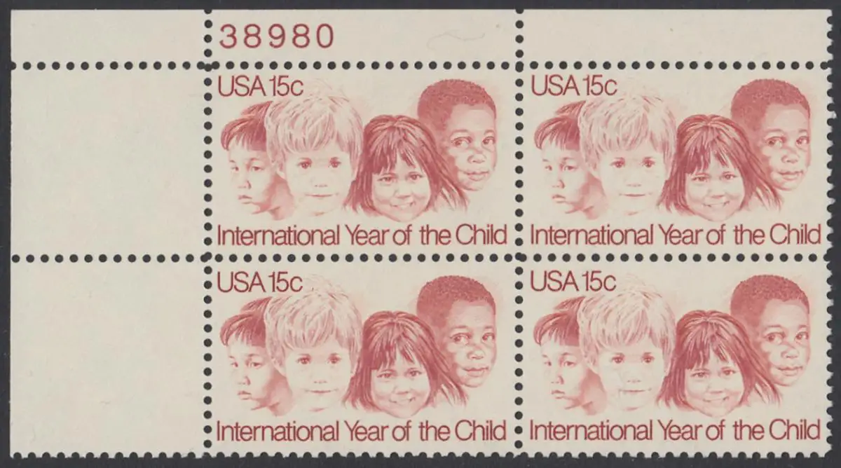 USA Michel 1373 / Scott 1772 postfrisch PLATEBLOCK ECKRAND oben links m/ Platten-# 38980 - Internationales Jahr des Kindes