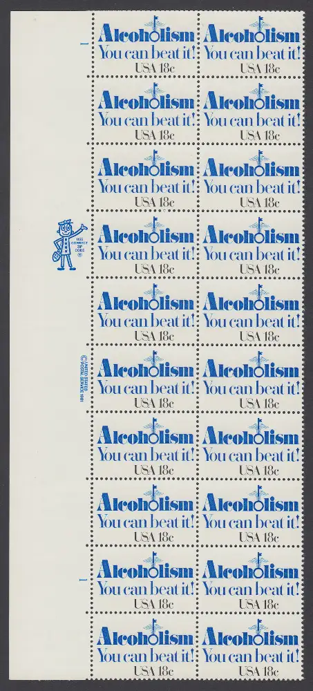USA Michel 1499 / Scott 1927 postfrisch vert.PLATEBLOCK(20) RÄNDER links m/ Platten-# 1 - Kampf gegen den Alkoholismus