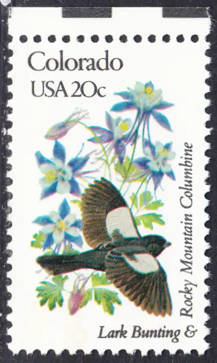 USA Michel 1537 / Scott 1958 postfrisch EINZELMARKE RAND oben (a1) - Vögel und Blumen der 50 Bundesstaaten: Colorado: Schwarzer Seidenschnäpper/Akelei