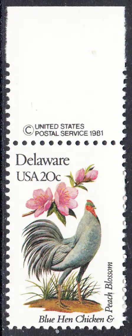 USA Michel 1539 / Scott 1960 postfrisch EINZELMARKE RAND oben (a1) - Vögel und Blumen der 50 Bundesstaaten: Delaware: Dunkles Waldhuhn/Pfirsichblüte