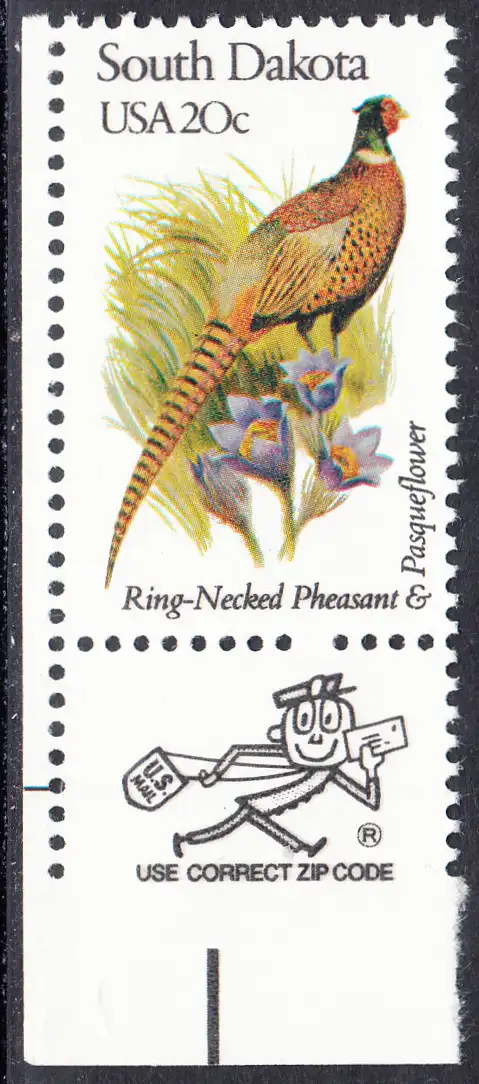 USA Michel 1572 / Scott 1993 postfrisch EINZELMARKE ECKRAND unten links m/ ZIP-emblem - Vögel und Blumen der 50 Bundesstaaten: South Dakota: Edelfasan/Küchenschelle