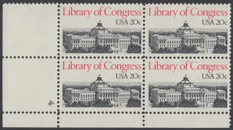 USA Michel 1583 / Scott 2004 postfrisch PLATEBLOCK ECKRAND unten links m/ Platten-# 4 - Kongressbibliothek: Thomas-Jefferson-Gebäude der Kongressbibliothek, Washington, DC