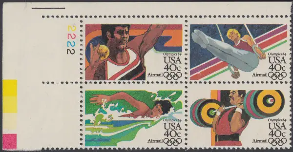 USA Michel 1622-1625 / Scott C105-C108 postfrisch PLATEBLOCK ECKRAND oben links m/ Platten-# 2222 - Olympische Sommerspiele 1984, Los Angeles
