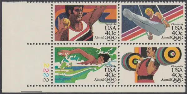 USA Michel 1622-1625 / Scott C105-C108 postfrisch PLATEBLOCK ECKRAND unten links m/ Platten-# 2222 (a) - Olympische Sommerspiele 1984, Los Angeles