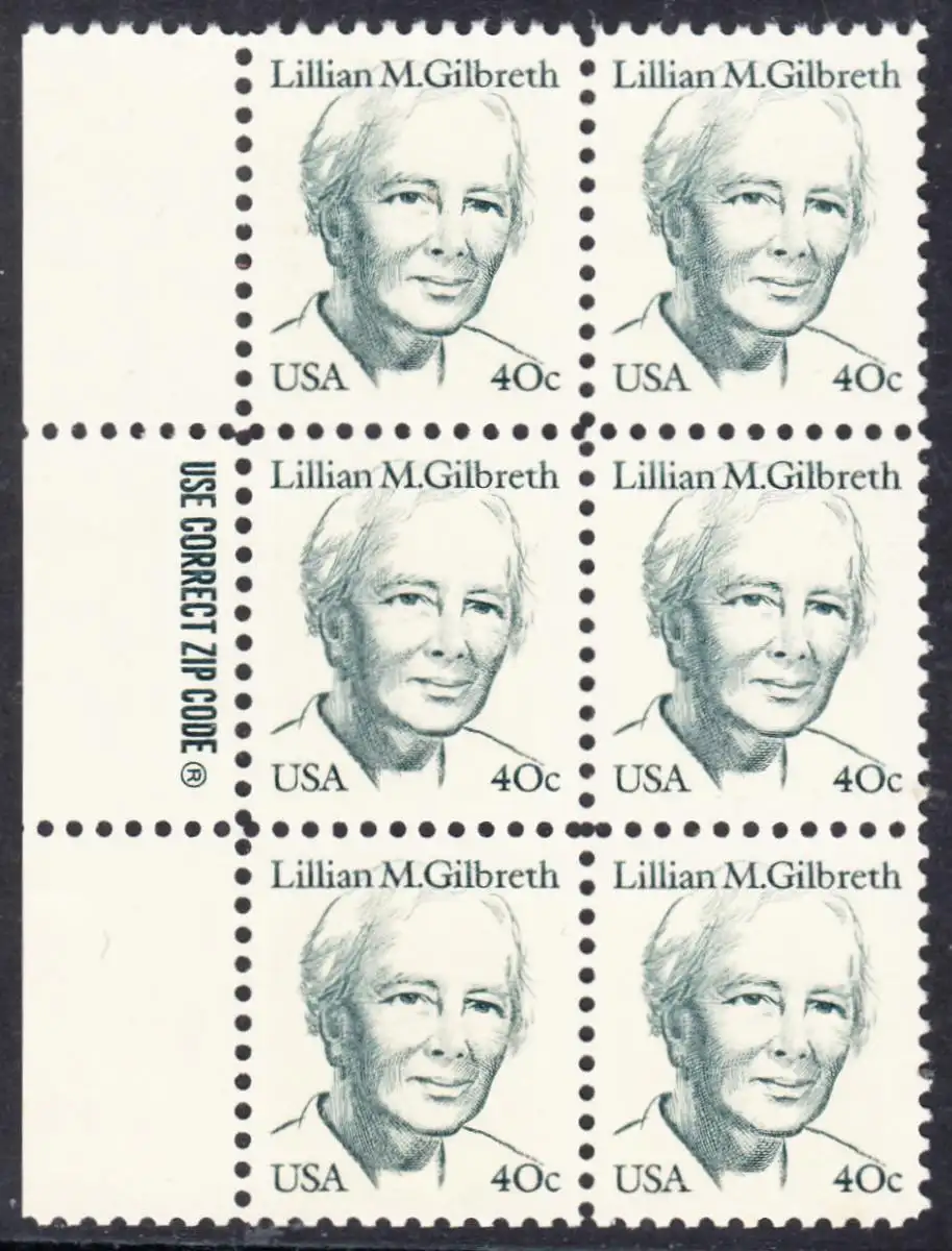 USA Michel 1682 / Scott 1868 postfrisch vert.BLOCK(6) RÄNDER links m/ ZIP-Emblem (a1) - Amerikanische Persönlichkeiten: Lilian M. Gilbreth (1878-1972), Ingenieurin