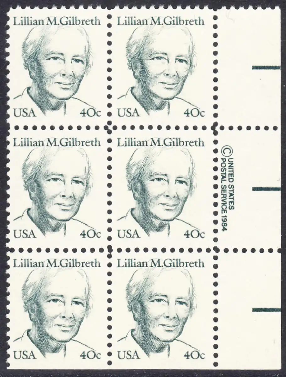 USA Michel 1682 / Scott 1868 postfrisch vert.BLOCK(6) RÄNDER rechts m/ copyright symbol - Amerikanische Persönlichkeiten: Lilian M. Gilbreth (1878-1972), Ingenieurin