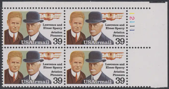 USA Michel 1726 / Scott C114 postfrisch PLATEBLOCK ECKRAND oben rechts m/ Platten-# 12111 - Luftpost: Flugpioniere - Lawrence (1892-1931) und Elmer Sperry (1860-1930), Flugboot Curtiss F
