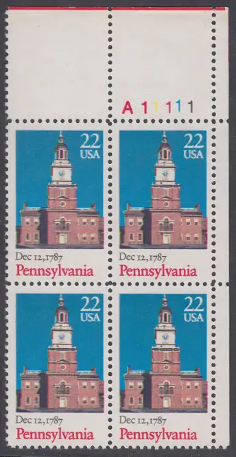 USA Michel 1942 / Scott 2337 postfrisch PLATEBLOCK ECKRAND oben rechts m/ Platten-# A11111 (e) - 200. Jahrestag der Ratifizierung der Verfassung durch den Staat Pennysylvania: Independence Hall, Philadelphia, PA