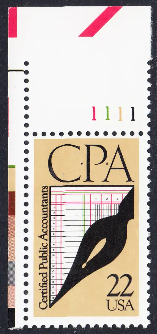 USA Michel 1950 / Scott 2361 postfrisch EINZELMARKE ECKRAND oben links m/ Platten-# 1111 - 100 Jahre staatlich zugelassene Wirtschaftsprüfer: Schreibfeder, Journal