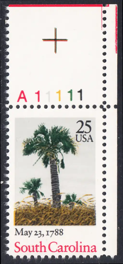 USA Michel 1979 / Scott 2343 postfrisch EINZELMARKE ECKRAND oben rechts m/ Platten-# A11111 (a2) - 200. Jahrestag der Ratifizierung der Verfassung durch den Staat South Carolina: Palmen am Strand