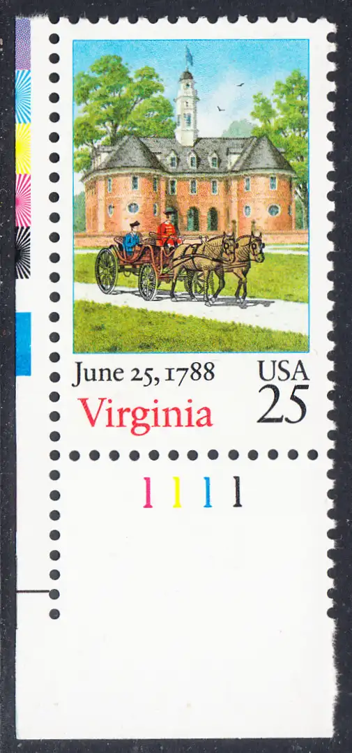 USA Michel 1987 / Scott 2345 postfrisch EINZELMARKE ECKRAND unten links m/ Platten-# 1111 - 200. Jahrestag der Ratifizierung der Verfassung durch den Staat Virginia: Capitol-Gebäude im Colonial National History Park, Williamsburg