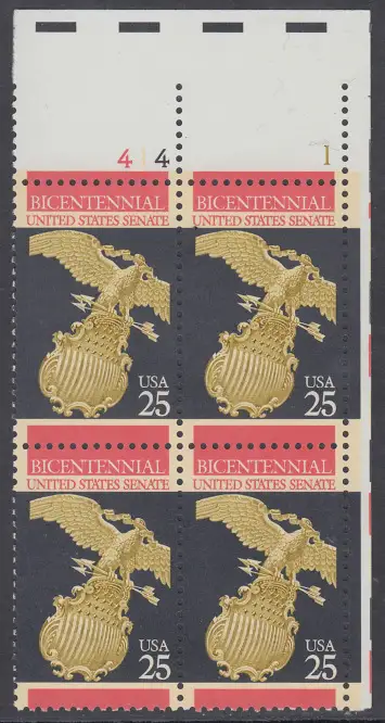 USA Michel 2039 / Scott 2413 postfrisch PLATEBLOCK ECKRAND oben rechts m/ Platten-# 1 - 200 Jahre Exekutive; George Washington (1732-1799) 1. Präsident (reg. 1789-97)
