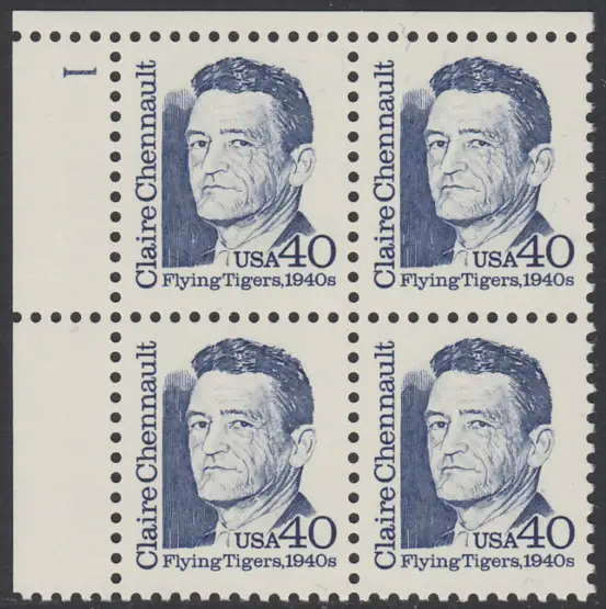 USA Michel 2104 / Scott 2187 postfrisch PLATEBLOCK ECKRAND oben links m/ Platten-# 1 (a) - Amerikanische Persönlichkeiten: Claire Lee Chennault (1890-1958), Generalleutnant der Luftwaffe