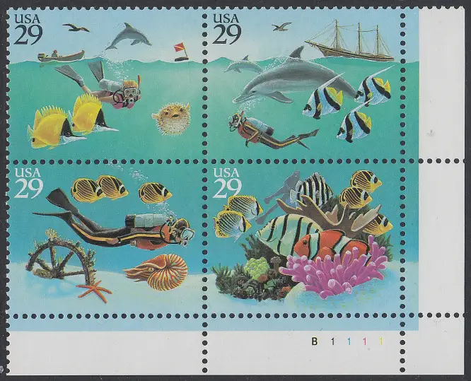 USA Michel 2500-2503 / Scott 2863-2866 postfrisch PLATEBLOCK ECKRAND unten rechts m/ Platten-# B1111 (a) - Wunder der Meere: Unterwasser-Szenerie