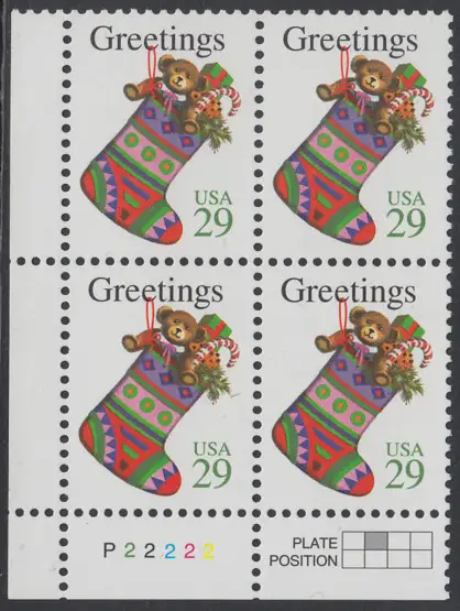 USA Michel 2527A / Scott 2872 postfrisch PLATEBLOCK ECKRAND unten links m/ Platten-# P2222 - Weihnachten: Strumpf mit Geschenken