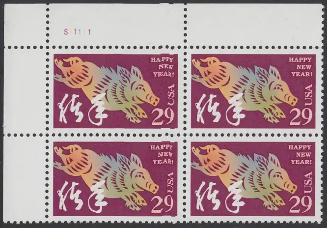 USA Michel 2541 / Scott 2876 postfrisch PLATEBLOCK ECKRAND oben links m/ Platten-# S11111 (b) - Chinesisches Neujahr: Jahr des Schweins
