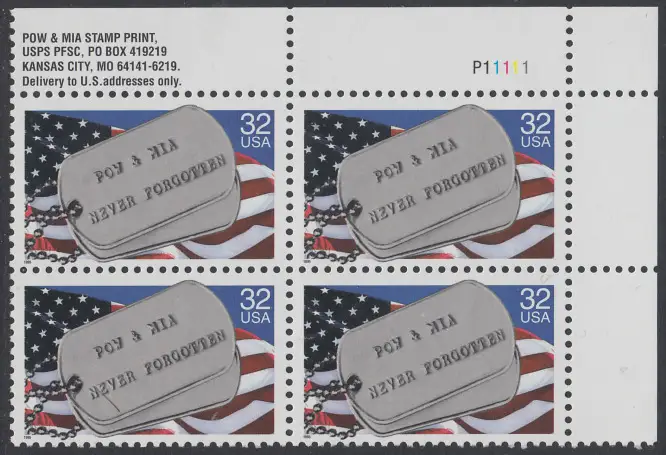 USA Michel 2569 / Scott 2966 postfrisch PLATEBLOCK ECKRAND oben rechts m/ Platten-# P11111 (b) - Kriegsgefangene und Vermißte; Militärische Erkennungsmarken, Staatsflagge