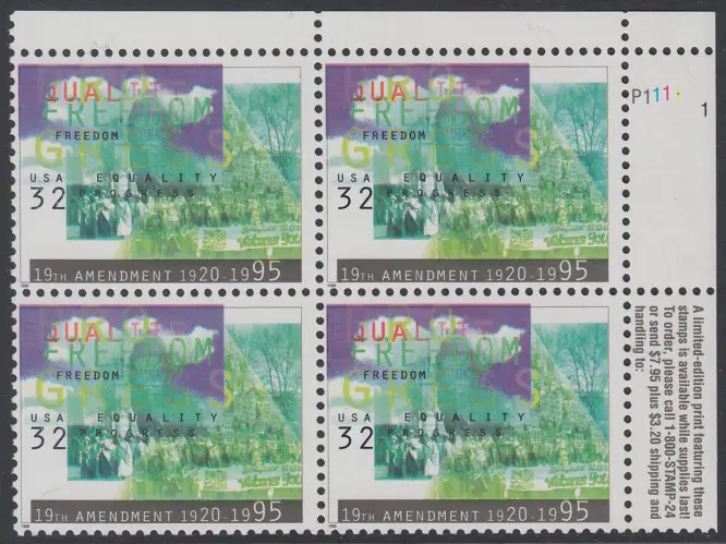 USA Michel 2614 / Scott 2980 postfrisch PLATEBLOCK ECKRAND oben rechts m/ Platten-# P1111-1 (b) - Frauenwahlrecht: 75 Jahre 19. Verfassungszusatz
