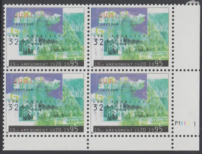 USA Michel 2614 / Scott 2980 postfrisch PLATEBLOCK ECKRAND unten rechts m/ Platten-# P1111-1 (b) - Frauenwahlrecht: 75 Jahre 19. Verfassungszusatz