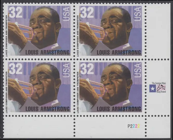 USA Michel 2615 / Scott 2982 postfrisch PLATEBLOCK ECKRAND unten rechts m/ Platten-# P1111 (a) - Amerikanische Musikgeschichte: Louis Armstrong (1901-1971), Jazztrompeter und Sänger