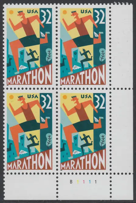 USA Michel 2703 / Scott 3067 postfrisch PLATEBLOCK ECKRAND unten rechts m/ Platten-# B1111 (a) - 100 Jahre Marathonlauf