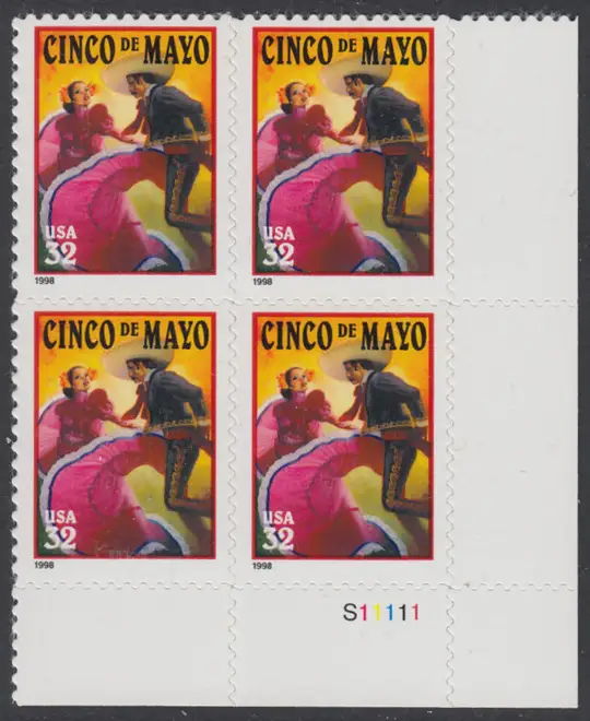 USA Michel 2949 / Scott 3203 postfrisch PLATEBLOCK ECKRAND unten rechts m/ Platten-# S11111 (c) - Lateinamerikanisches Cinco-de-Mayo-Fest; Tanzpaar in mexikanischer Tracht