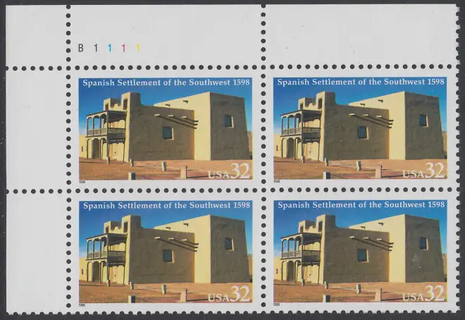 USA Michel 2983 / Scott 3220 postfrisch PLATEBLOCK ECKRAND oben links m/ Platten-# B1111 (a) - 400 Jahre spanische Besiedlung im Südwesten der USA; La Mision de San Gabriel in Española, New Mexico