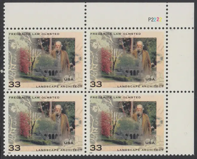 USA Michel 3164 / Scott 3338 postfrisch PLATEBLOCK ECKRAND oben rechts m/ Platten-# P2222 - Frederick L. Olmsted; Landschaftsarchitekt