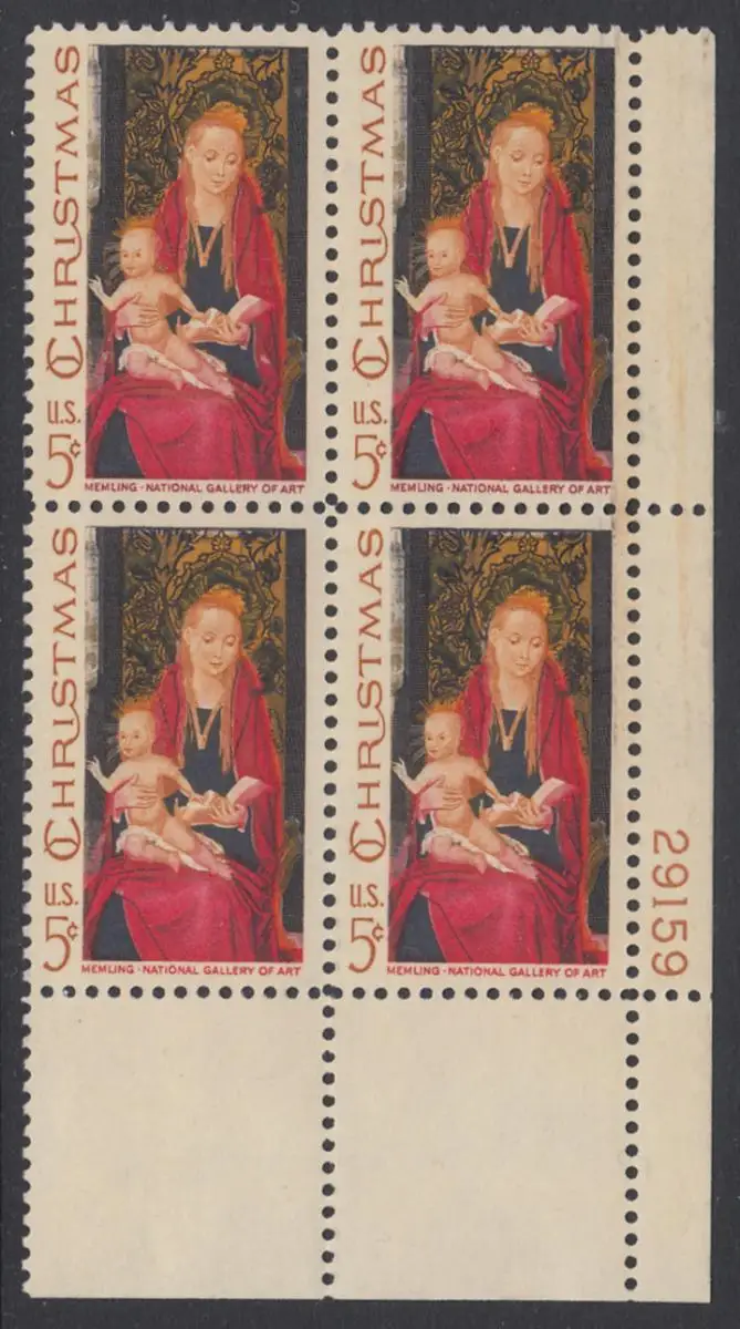 USA Michel 937 / Scott 1336 postfrisch PLATEBLOCK ECKRAND unten rechts m/ Platten-# 29159 - Weihnachten: Maria mit Kind und Engeln