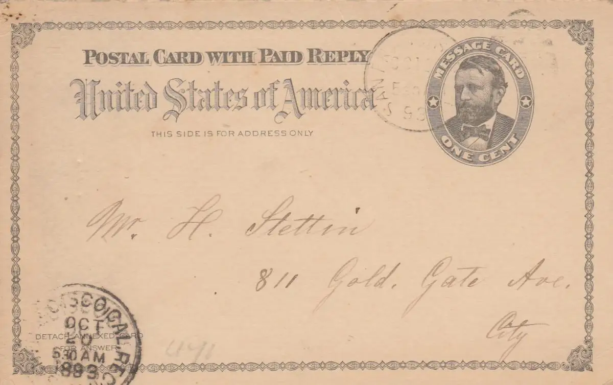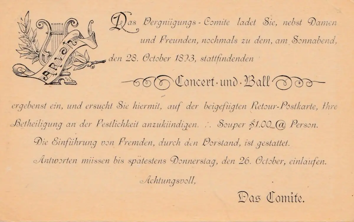 USA: Postal card, paid reply 1893, Vergnügungs Comite -Ball-Concert