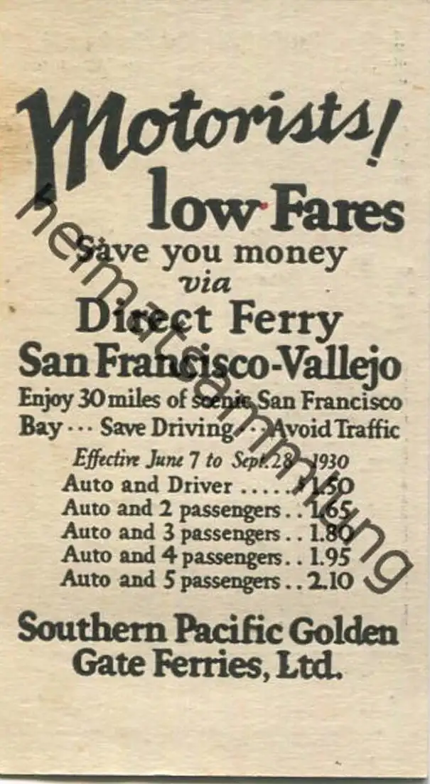 USA - Southern Pacific Golden Gate Ferries Ltd. - automobile traveling - Fahrplan für den Autotransport vom 7. Juni bis 28. September 1930 - Visitenkartengröße (G51812)