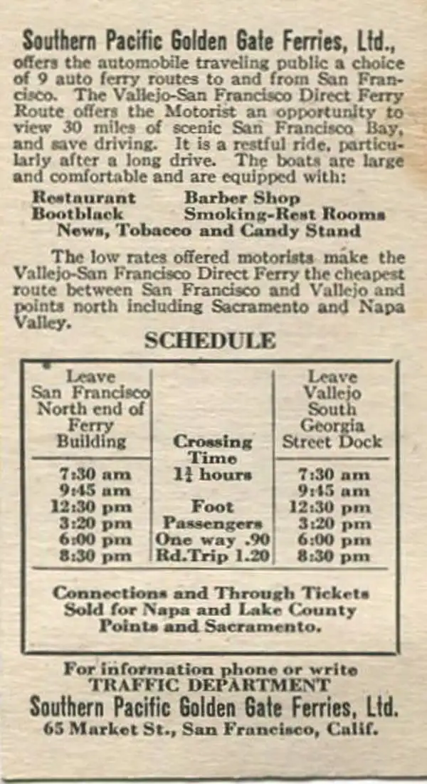 USA - Southern Pacific Golden Gate Ferries Ltd. - automobile traveling - Fahrplan für den Autotransport vom 7. Juni bis