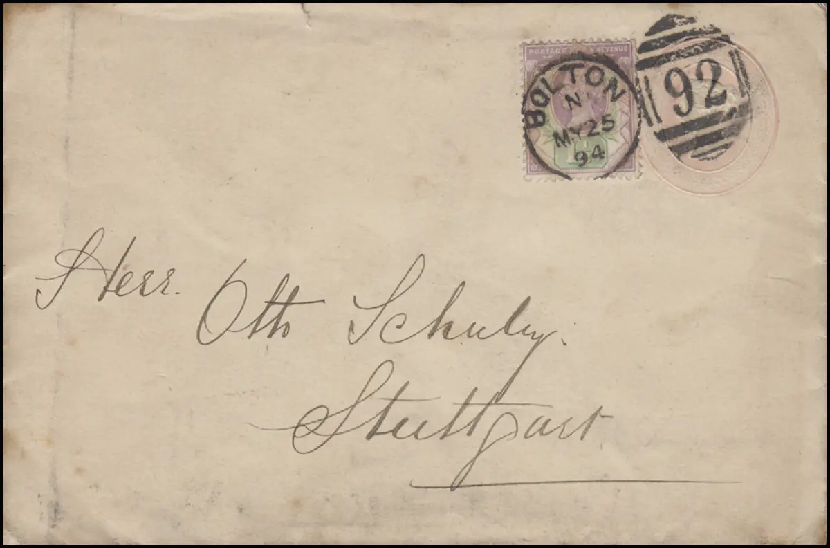 USA Umschlag mit Zusatzfrankatur BOLTON 25.5.94 DUP 92 nach STUTTGART 27.5.