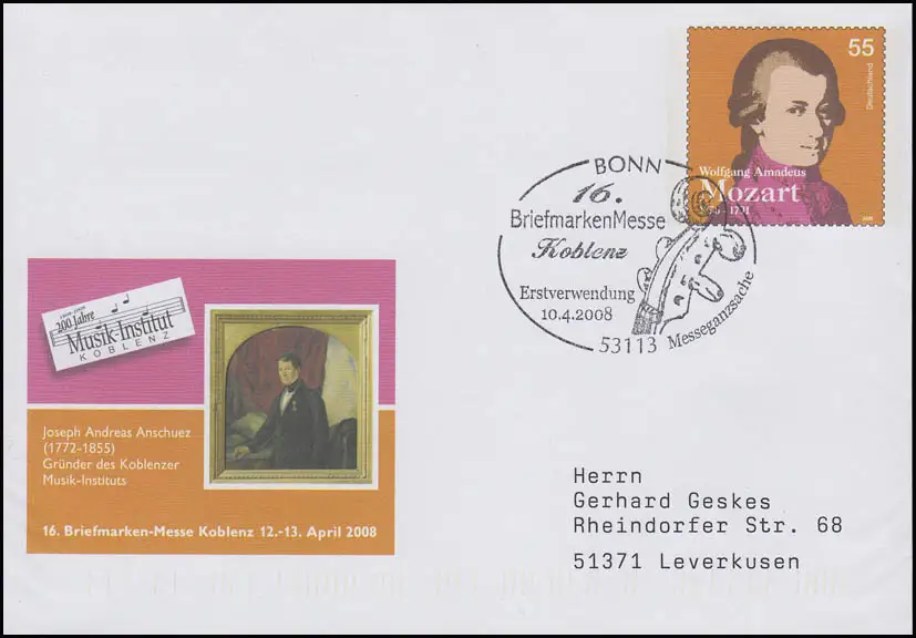 USo 149 Koblenz Musik-Institut Anschuez, FDC Erstverwendung Bonn Messe 10.4.2008