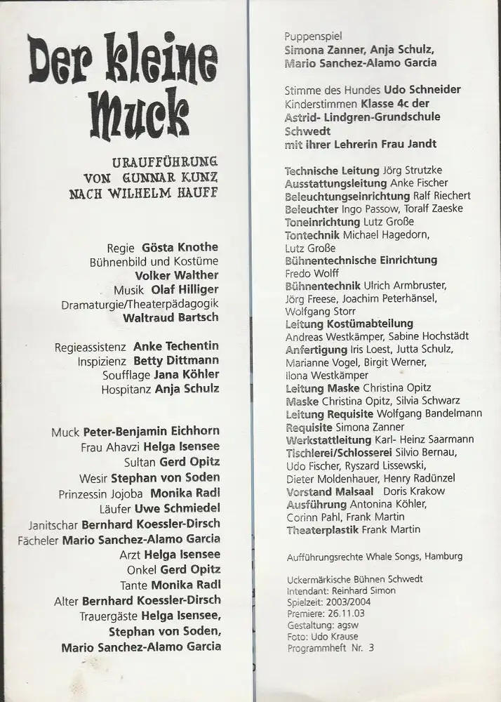 Uckermärkische Bühnen Schwedt, Reinhard Simon, Udo Krause: Programmheft Uraufführung Wilhelm Hauff DER KLEINE MUCK Premiere 26.November 2003 Spielzeit 2003 / 04 Heft 3.