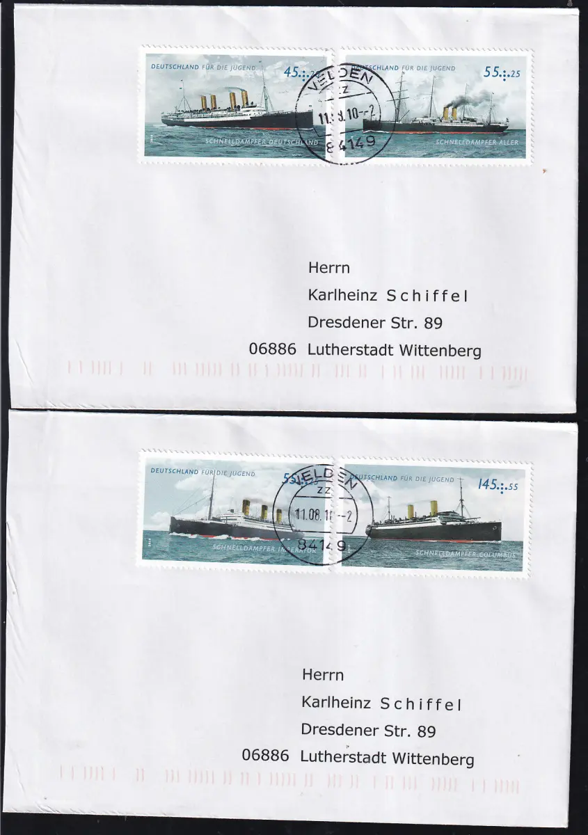 zwei sehr schöne Bahnpostbelege, einmal HUSUM-GARDING von 1916 - ohne Zugnummer aufgrund der Furcht vor feindlicher Spionage - und ERFURT-EISENACH von 1965. Vielen Dank, bin mit der Lieferung sehr zufrieden.