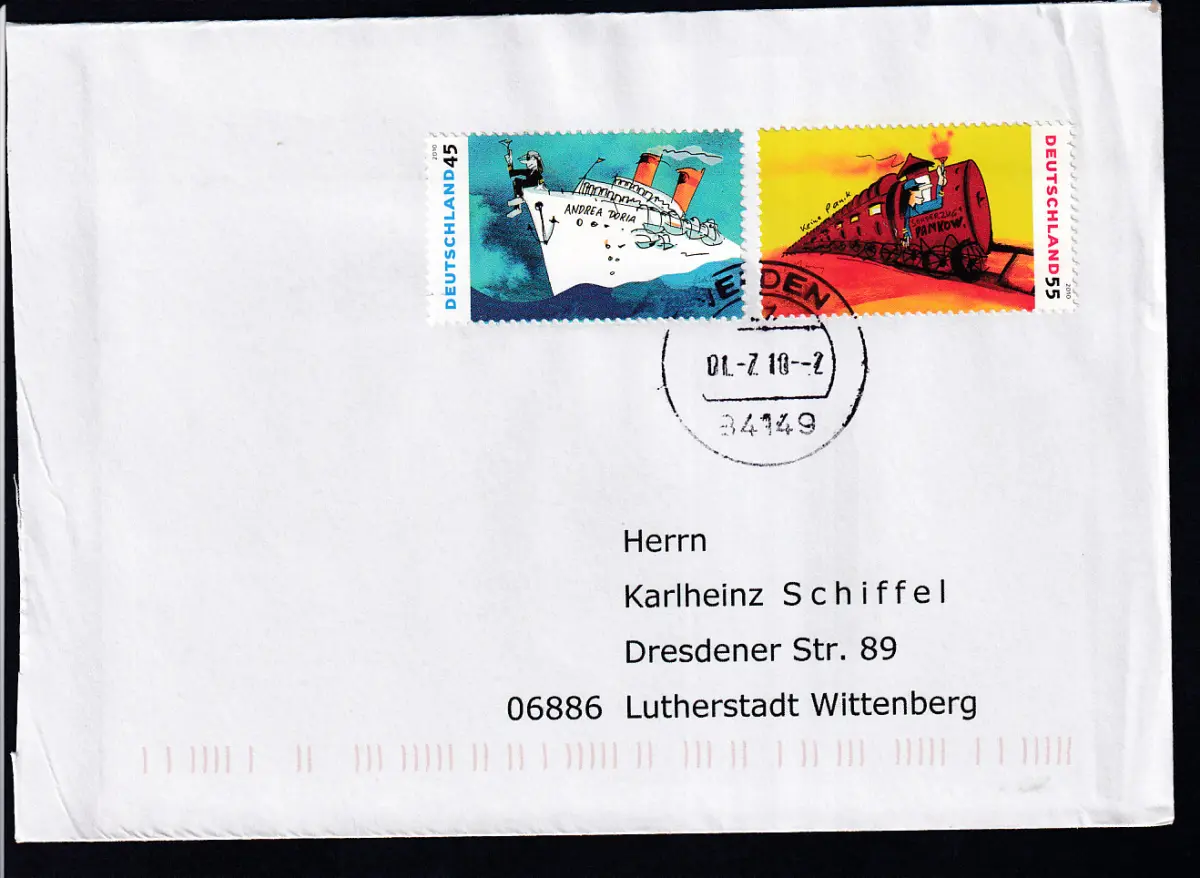 zwei sehr schöne Bahnpostbelege, einmal HUSUM-GARDING von 1916 - ohne Zugnummer aufgrund der Furcht vor feindlicher Spionage - und ERFURT-EISENACH von 1965. Vielen Dank, bin mit der Lieferung sehr zufrieden.