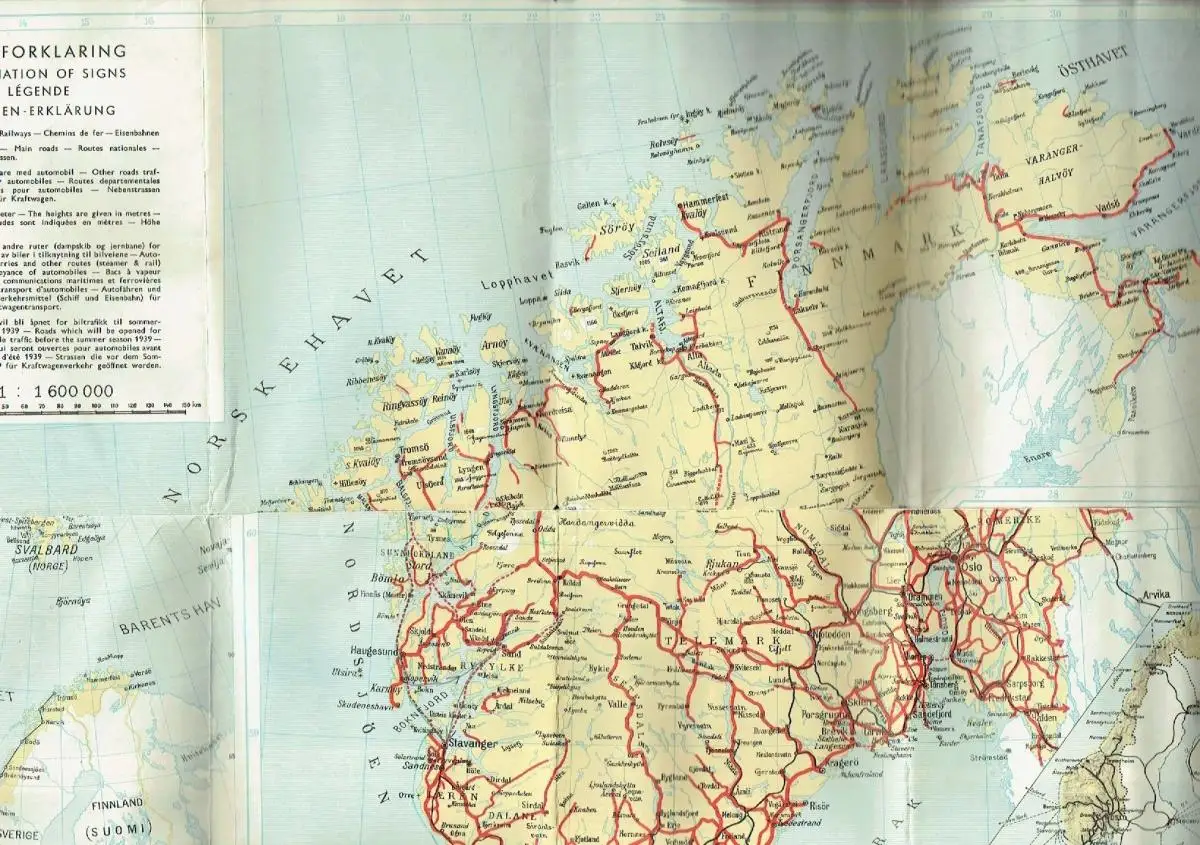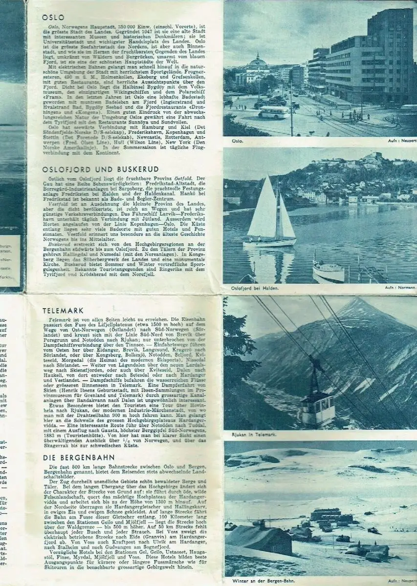 guter Zustand, geringe Gebrauchs- und Alterungsspuren: Falzkreuze gering aufgerissen - Falze an den Kartenrändern teils gering eingerissen - Karte sonst sauber und ordentlich, überreicht von der Bergenske Gesellschaft (B. & N. Line), Bergen Beschreibung von Sörland und Setesdal, Rogaland, Oslo, Oslofjord und Buskerud, Telemark, Westlandsfjorde, Gudbrandsdalen mit Jotunheimen und Valdres, Bergen, Möre und Romsdal, Tröndelag und Österdalene, Nord-Norwegen und der Bergenbahn, Papier, ca. 12 x 18 (aufgeklappt ca. 48 x 72), 32 Seiten mit 16 Fotos und 4 Karten