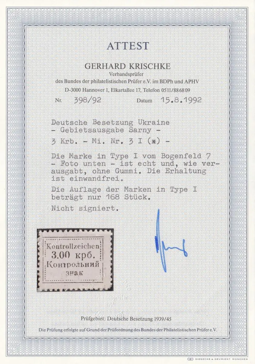 Ukraine: MiNr. 3I *, BPP Attest