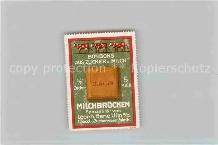 Ulm Donau Milchbrocken Bonbons aus Zucker und Milch Leonhard Bene Ulm postalisch nicht gelaufen 1921-1965 Werbemarke (keine Postkarte) Erhaltung siehe scans [KathaD79] Werbemarke (keine Postkarte) Kathoren